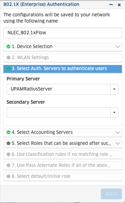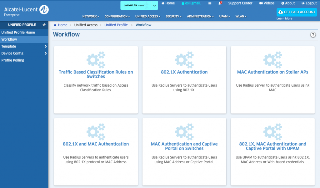 De eerste items die aangemaakt moeten worden zijn de Access Profiles. Dit doe je vanuit het menu Unified Access -> Unified Profile Home. Vanuit de Workflow pagina kan je eenvoudig een authenticatie flow aanmaken, zoals 802.1x Authentication.