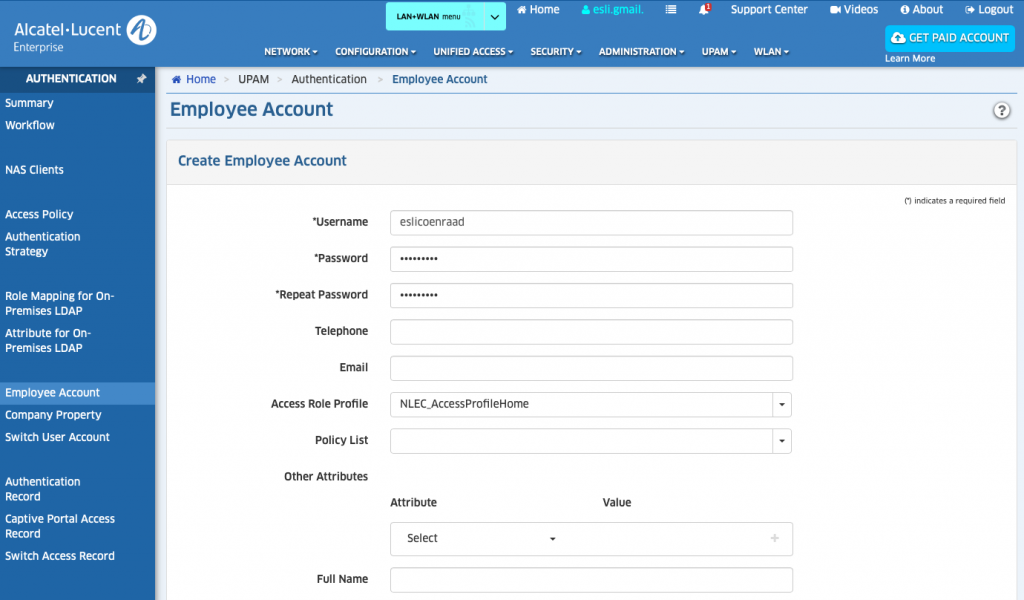 Vanuit de UPAM -> Authentication ga je naar Employee Account. Hier druk je op het plus-teken en voeg je een nieuwe gebruiker toe. Kies bij Access Role Profile het juiste profiel, zodat de gebruiker bij het inloggen in het juiste netwerk geplaatst wordt.